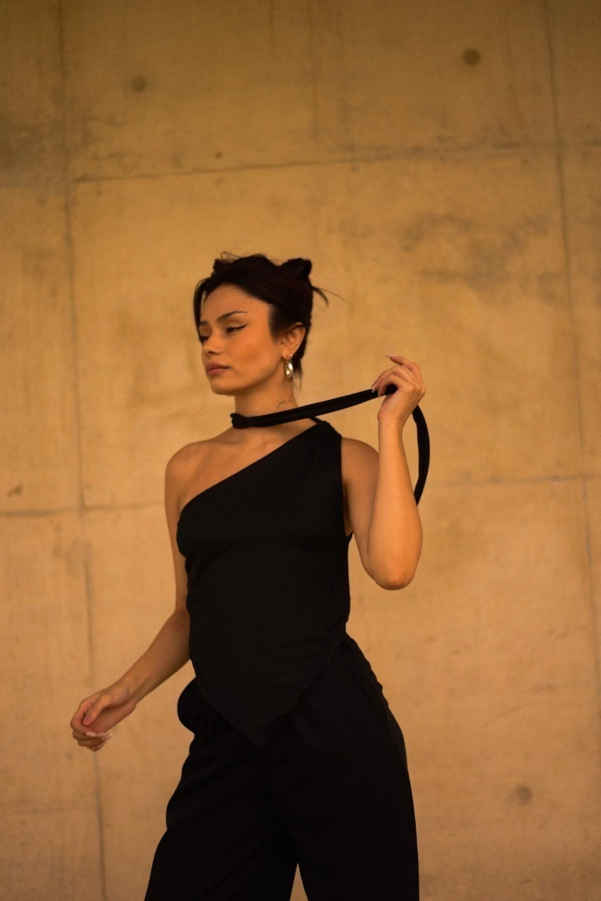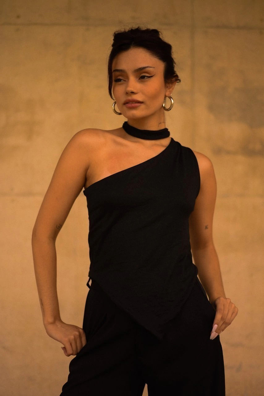 Top Charlotte Negro confeccionado en modal doble, suave y forrado con la misma tela para garantizar que no se transparente. Cuenta con hombro regulable y tira para atar al cuello, ofreciendo un ajuste personalizado y cómodo.